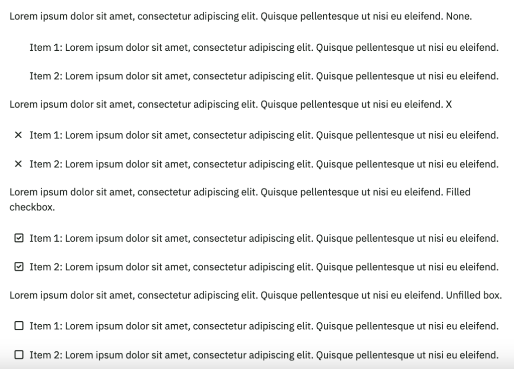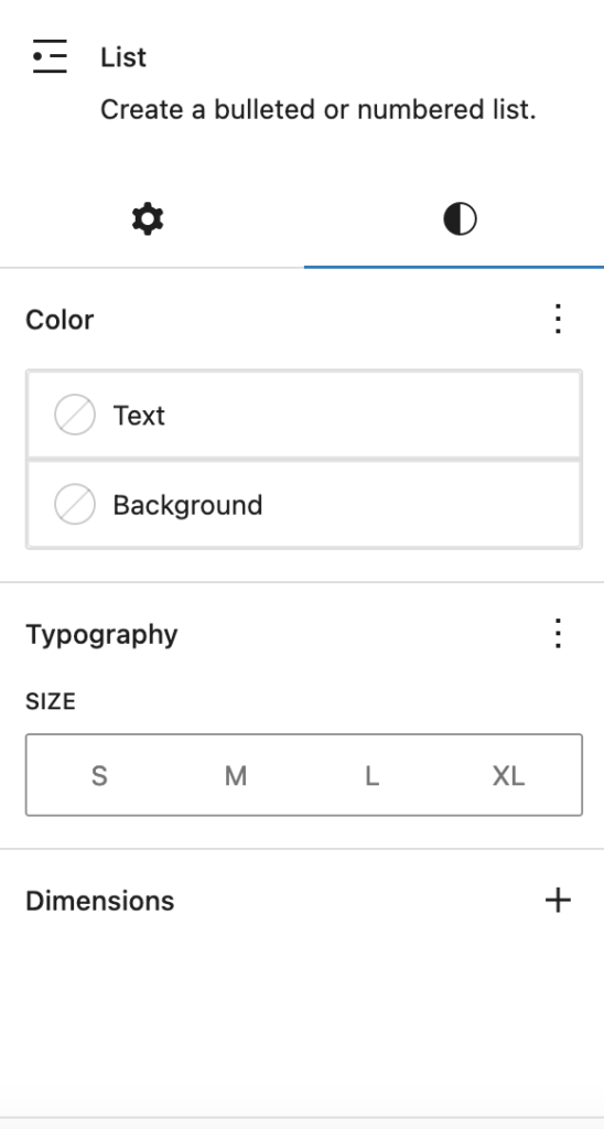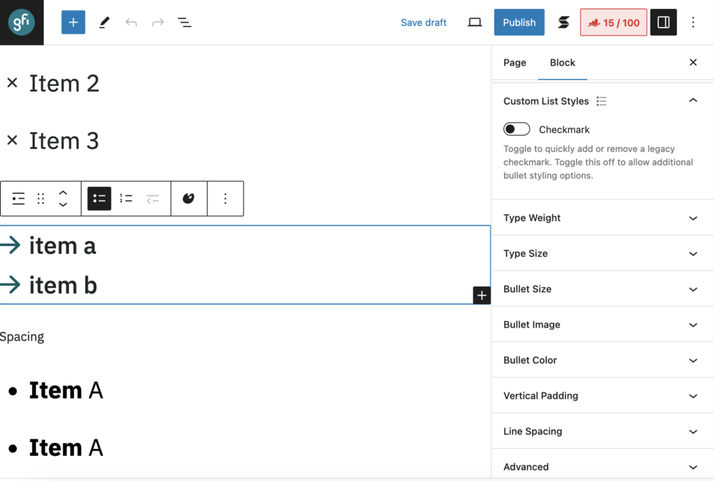 If you need more control over bullet appearance, use the menu options described above but do not combine these styles with the checkmark toggle or with WordPress core typography controls affecting the same styles (ie type size or type weight). Trying to combine these may result in unexpected behavior outside of the control of our Theme, especially as WordPress core gets updated.